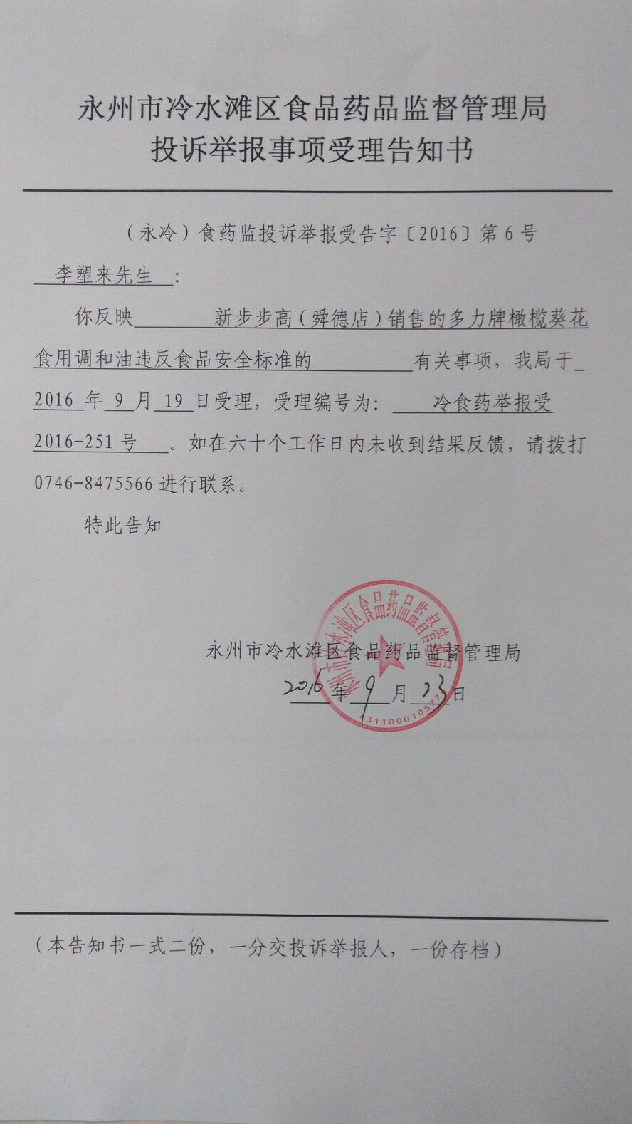 爆料:湖南省永州市步步高商业连锁股份有限公司因销售不符合食品安全国家标准的“多力”橄榄葵花食用调和油被永州市冷水滩区食品药品监督管理局查处并现场扣押违法产品!