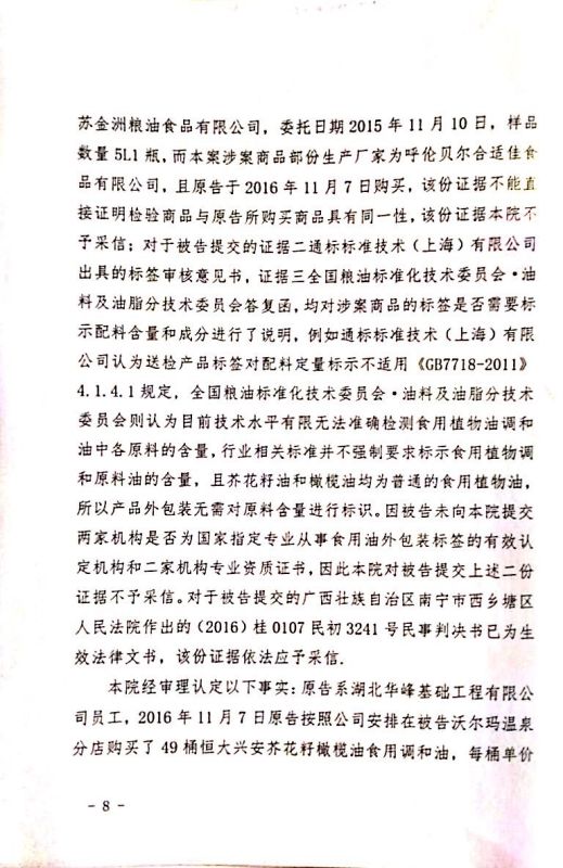 [橄榄调和油追踪78]湖北咸宁咸安区法院 支持消费者对违法恒大兴安芥花籽橄榄油十倍价款赔偿诉求