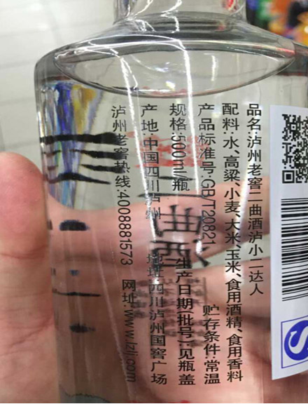 某品牌的老窖二曲酒,品名泸小二达人,市场售价约为29.8元。同样,其执行标准与产品正面备注信息均表示该款酒为液态法白酒,但其成分含量表内却仍有高粱、小麦、大米等粮食成分。